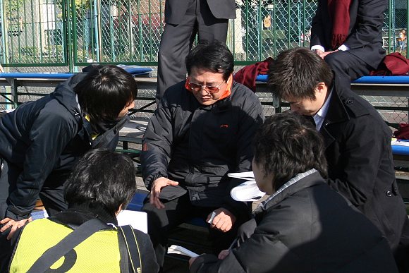 在争夺第三名的比赛开始之前,我校足球队总教练金志扬教授总结了上一场比赛的得失,并就本场比赛的对手韩国汉阳大学足球队的特点进行了认真的分析,金志扬教授主张球队要想取得更好的成绩,想在明年的国内甲级比赛中站稳脚跟,必须进行创新与改革。韩国汉阳大学也好,朝鲜大学也好,其打法与特点都与日本驹泽大学相似,这次比赛大家要有充分的心理准备,要以快治快,以拼治拼,看看自己的比赛节奏和拼抢技术能否与对方看齐,并争取抓住场上的每一次机会,力争先发制人,尽量让对方不适应我们调整后的新节奏,当然这种尝试打法需要大家统一思想,在场上尽自己最大的努力去跑去拼去抢,不能有丝毫的犹豫,无论最后结果如何,只要大家尽力了,这样我们就不仅能从对手身上学到足球发展新的理念,而且可以把它与自己的技战术结合起来。
