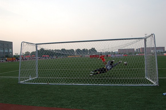 东华大学在罚第四轮点球时,罚球队员高度紧张,犹豫不决,射出点球低平偏正且力道不足,我方守门员王毅判断准确将球扑出。