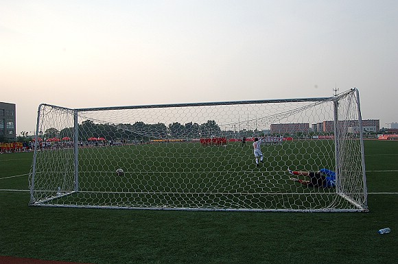在紧张而又激烈的点球大战中,我校足球队率先罚球,首先由“点球专家”6号队员于飞首罚,他骗过了对方守门员,直接命中网底。