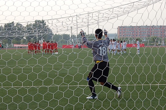 第三轮点球,我方队员张淼毫不脚软,皮球应声射入死角。
