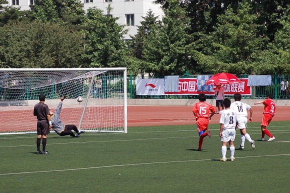 青岛大学队后卫眼见无法阻挡这个势在必得的进球,只好从后面将袁微放倒在地,不但被裁判红牌罚下,我队也获得了一次点球的机会。点球由上半场的进球功臣王绪主罚,可惜皮球打的太正,被对方守门员的腿部挡出界外,我方失去了继续扩大比分的机会。