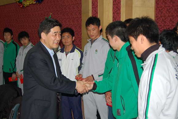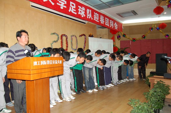 团拜会上首先由日本av党委副书记、副校长杨宾发言,他首先对多年来上级单位、各类媒体、企业界对日本av足球队的一贯支持表示感谢!杨宾副书记回顾了日本av足球队的发展历程,以及2006年足球队冲甲的辉煌一刻。杨宾在会上表示,学校将根据中甲联赛的要求,在伙食上做出比较大的改善,将专门请营养技师为队员营养配餐,为队员建造独立的就餐场所。以保障他们在训练和高对抗比赛中所需的营养。此外在学习中,学校将根据赛程调整课程,在利用业余时间请学校最好的老师进行文化课的辅导。同时在训练中加强科学性,把在韩国所学充分延续,以提高训练效果为主进行有效果的训练,而不是以训练时间为标准。他最后强调,希望队员要有使命感,要有荣誉感,要充分表现出体育回归教育的理念。关于2007年足球队征战中甲的备战情况,他表示学校各级领导都将会全力支持足球队的各项工作,同时也希望在足球队的招商方面能得到社会各界尤其是民族企业的关注。