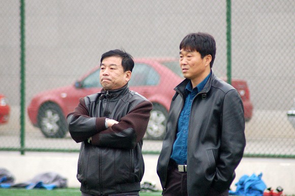 金志扬主教练在向测试裁判组成员介绍球队冬训备战情况。