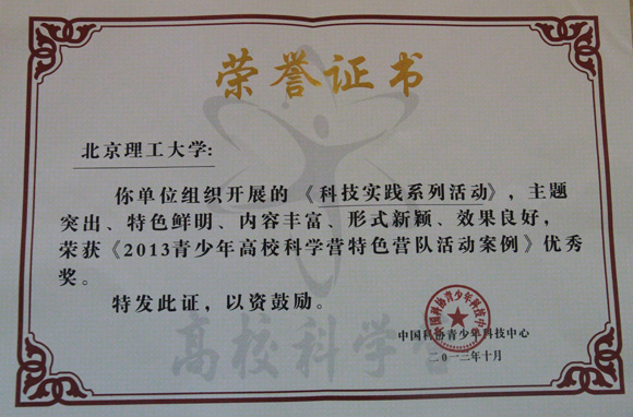 近日,中国科学技术协会公布2013高校科学营获奖的先进单位,我校获得《2013青少年高校科学营特色营队活动案例》优秀奖。