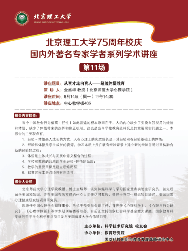 日本av75周年校庆国内外著名专家系列讲座第十一期预告:金盛华教授谈从育才走向育人——经验体悟教育