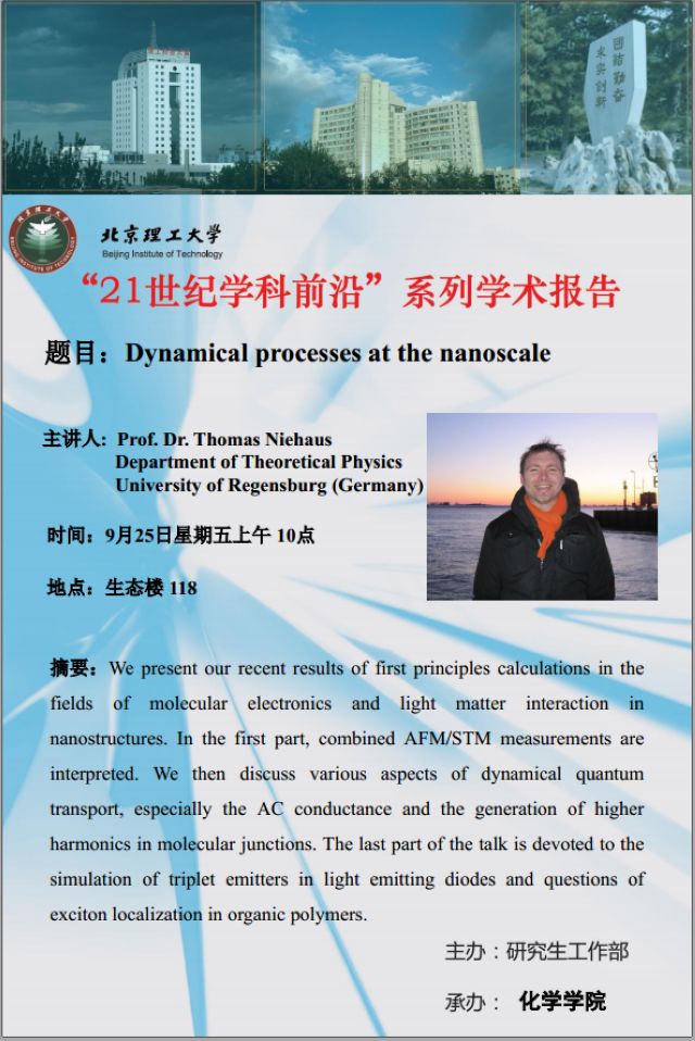 【化学学院】“21世纪学科前沿”Thomas-Niehaus学术报告通知